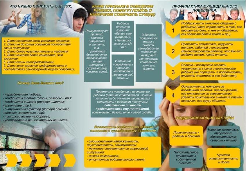 В тоже время одним из сильных факторов, удерживающих молодых людей в жизни, являются отношения с родителями. Если отношения строятся на доверительной основе, родитель относится к ребенку как к партнеру, то тогда формируются защитные механизмы, предохраняющие подростка от суицидального поведения.
